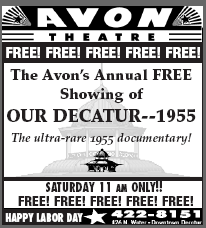 2.) SATURDAY MORNING @ 11:00 AM, FREE!! "OUR DECATUR 1955" This is the ultra-rare, hour-long documentary made about Decatur back in 1955! We own the ONLY known copy of it, and it is NOT available on video! Step into our time machine and see a bustling downtown, prospering businesses, happy people, and a city that had optimism! This is actually very funny in spots, but it is quite a learning experience too!